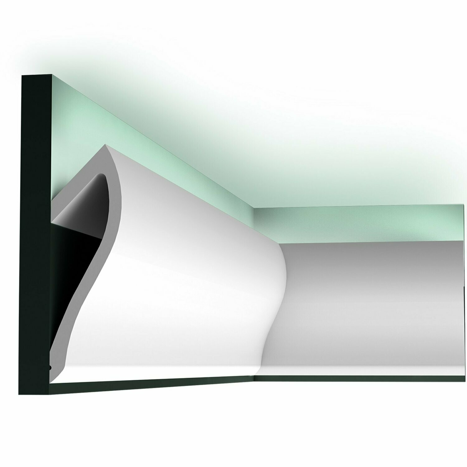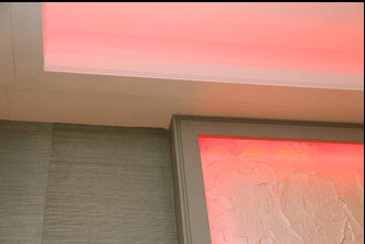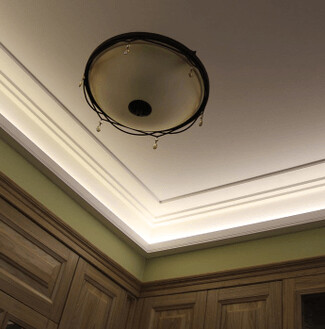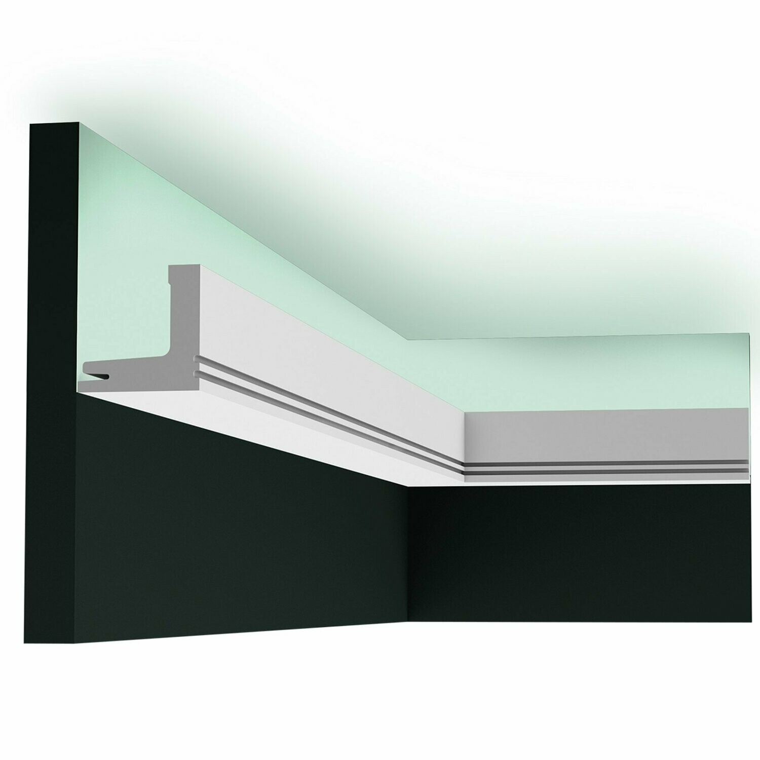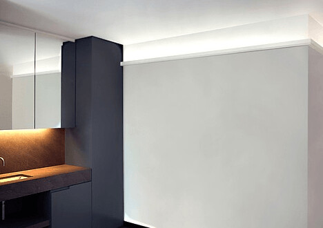 Cornisa de iluminación sobria e intemporal. La sutil doble junta aporta justo ese toque extra a tu estancia. Diseño de Pierre Daems.