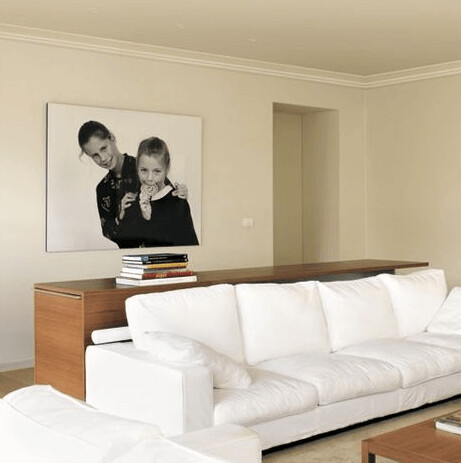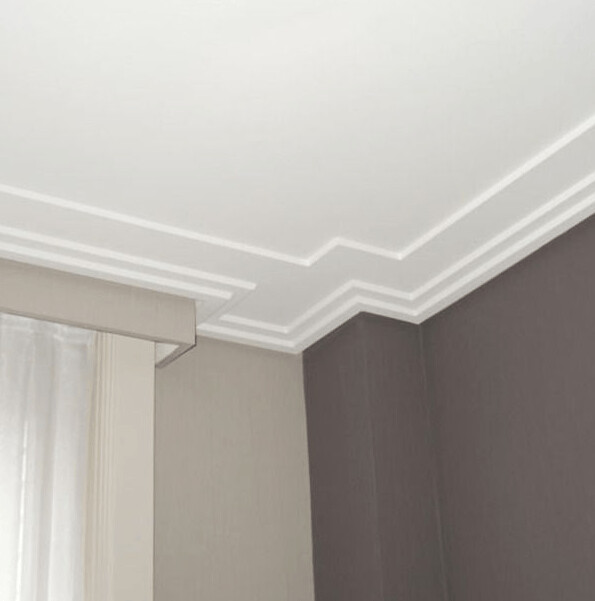Una cornisa plana que se extiende hasta el techo y cuya línea de sombra empotrada en la parte posterior crea un intrigante efecto flotante.