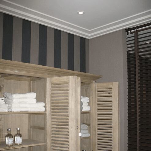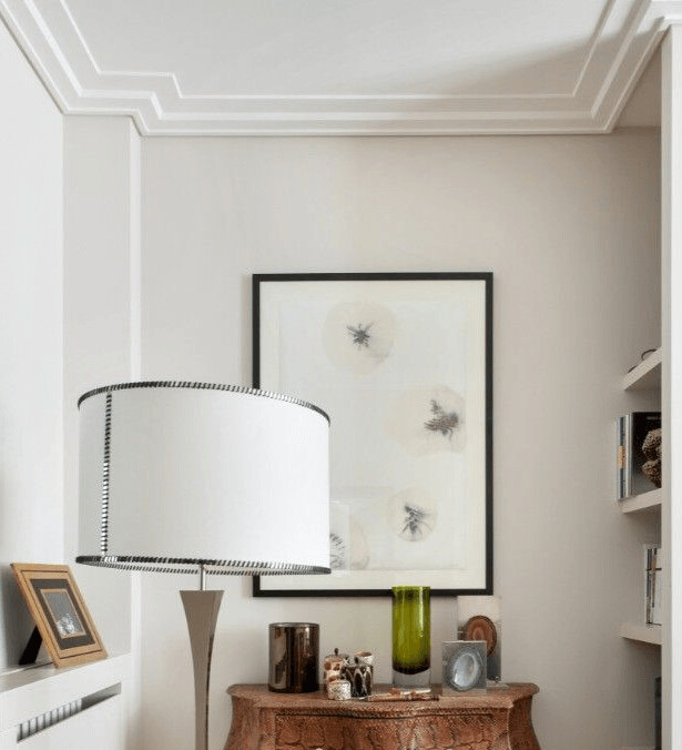 Esta cornisa lisa, que pasa sobre el techo, aporta un efecto de flotación gracias a su línea de sombras repujada. Diseño de Jacques Vergracht.
