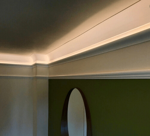 Una elegante moldura de poliuretano , con cantos muy finos , que encaja perfectamente entre las paredes y el techo, un diseño contemporáneo, para todos los estilos de decoración.