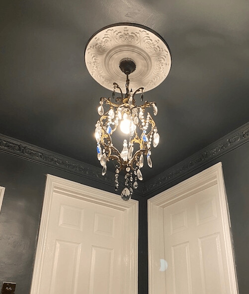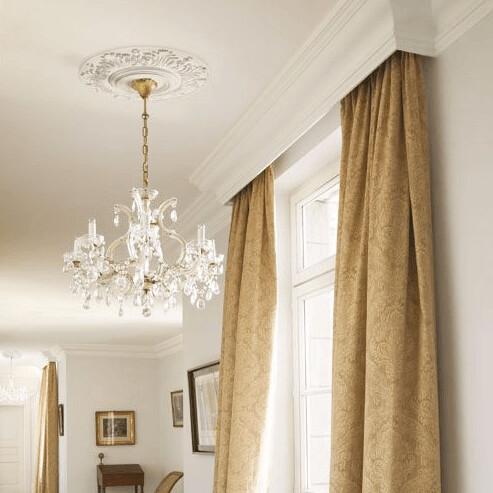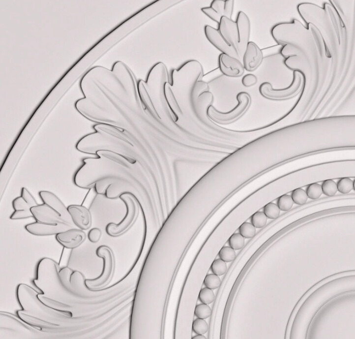 Rosetón redondo con hojas en relieve bajo y flores con cuentas redondas. Ofrece la posibilidad de ocultar cables. Espacio para clables.