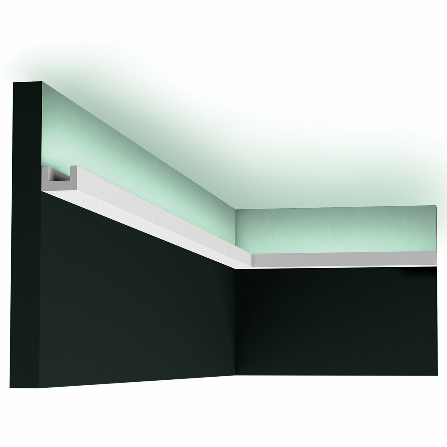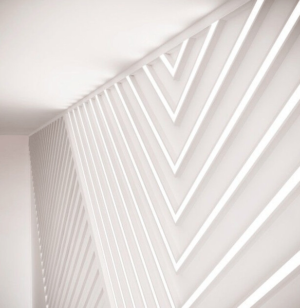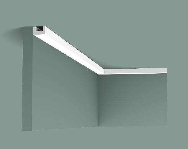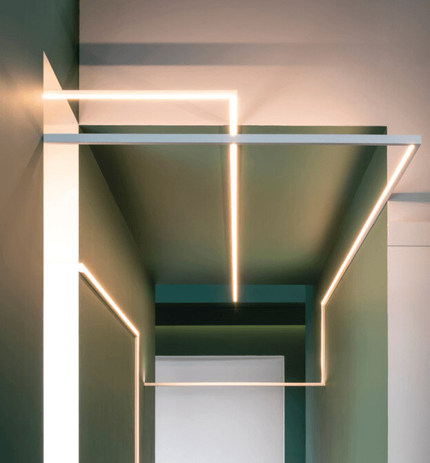 Perfil sutil y a prueba de golpes en forma de U. Solución práctica para camuflar los cables de pared y techo. Diseño de Orio Tonini.